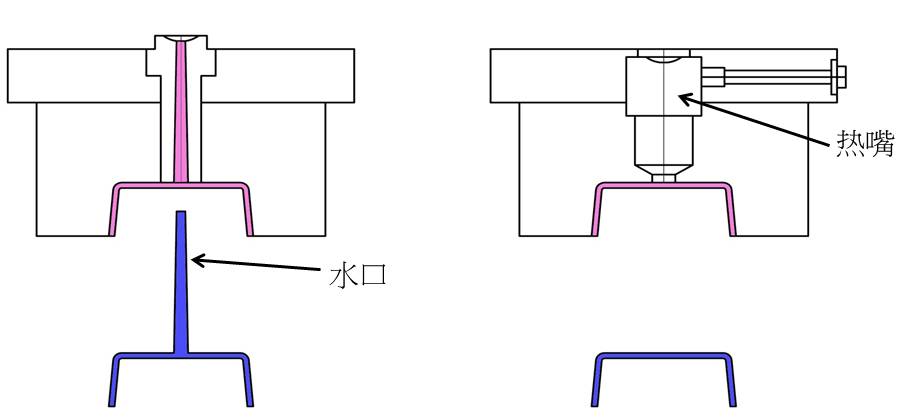 5.澆口開在深形零件內側有些工業產品對外觀要求極其嚴格, 在使用十不許暴露任何澆口痕跡, 小的此類零件如化妝品口紅筆蓋,大到汽車內飾零件。這時候就需要將澆口開在零件內側。當零件深度過大的時候就不可能用冷流道澆口,而只能使用熱流道噴嘴伸進零件內側注塑成型。