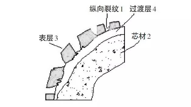(1)縱向斷裂處空隙的表面積大于表層金屬層3表面積的5%而小于40%,縱向斷裂處的裂紋形狀呈不規則狀態分布。過渡層的鋅原子由內向外呈線性增加分布、銅原子由內向外呈線性減少分布。這種銅鋅含量的分布方式,使得表層金屬和芯材金屬融為一體,減少了表層金屬的脫落,有助于切割。