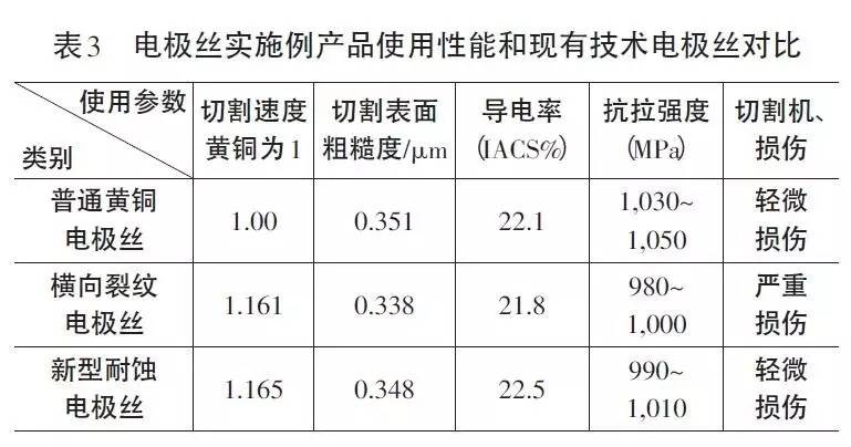 綜上所述,電極絲的導電率有所提高,且切割出來料件的粗糙度值同同種類型的線對比線接近;力學性能稍低,但在電極絲性能正常范圍內,不影響使用;從對比可看出:同普通黃銅電極絲對切割設備的損傷一致,比橫向的電極絲要優;同時,因為電極絲的裂紋是同電極絲移動方向一致的,便于自動穿絲。
