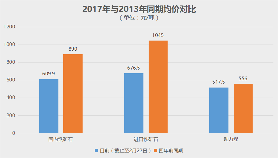可以看出,盡管在2016年年底,煤炭?jī)r(jià)格經(jīng)過(guò)一輪瘋狂上漲,但由于此前跌幅過(guò)大,目前價(jià)格并未恢復(fù)到當(dāng)初的水平。而原本漲幅居后的國(guó)內(nèi)鋼價(jià),在春節(jié)之后這一輪瘋狂拉漲之后,漲幅已經(jīng)后來(lái)居上。
